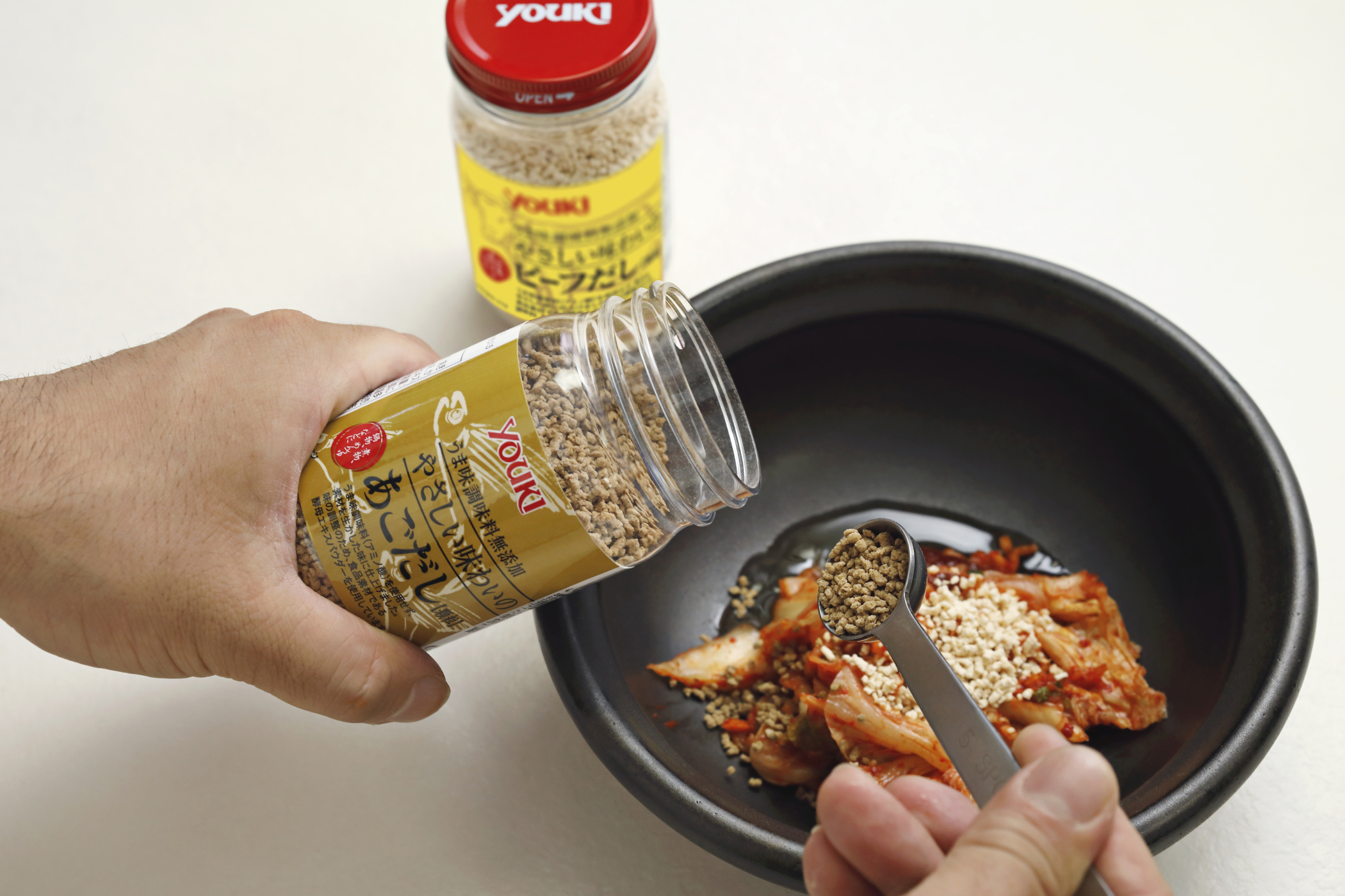 豆腐と牛肉のだしに、あさりなどの魚介のうまみを合わせて作る韓国の鍋料理を、あごだし+ビーフだしの合わせ技で再現! うまみ抜群で、キムチと豆腐だけのシンプルな具だけでも、大満足のおいしさに。