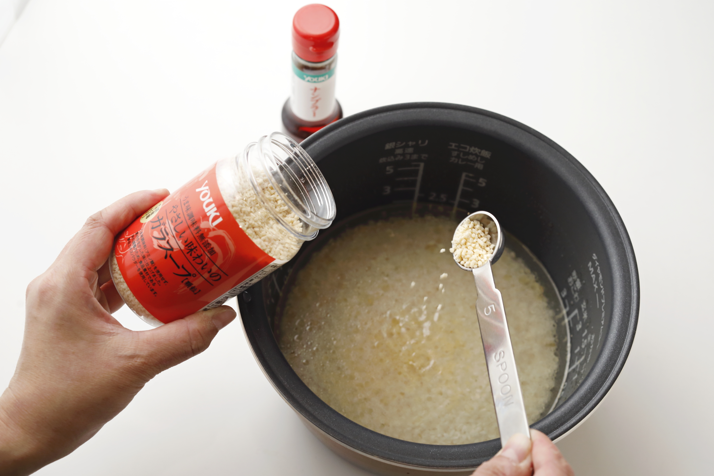 ②炊飯器の内釜に米を入れて〈A〉の材料を加え、2合の目盛りまで水を注ぐ。〈B〉の材料を加えて混ぜ、香菜の茎を入れてひと混ぜする。豚肉・れんこんを広げてのせ、普通に炊く。