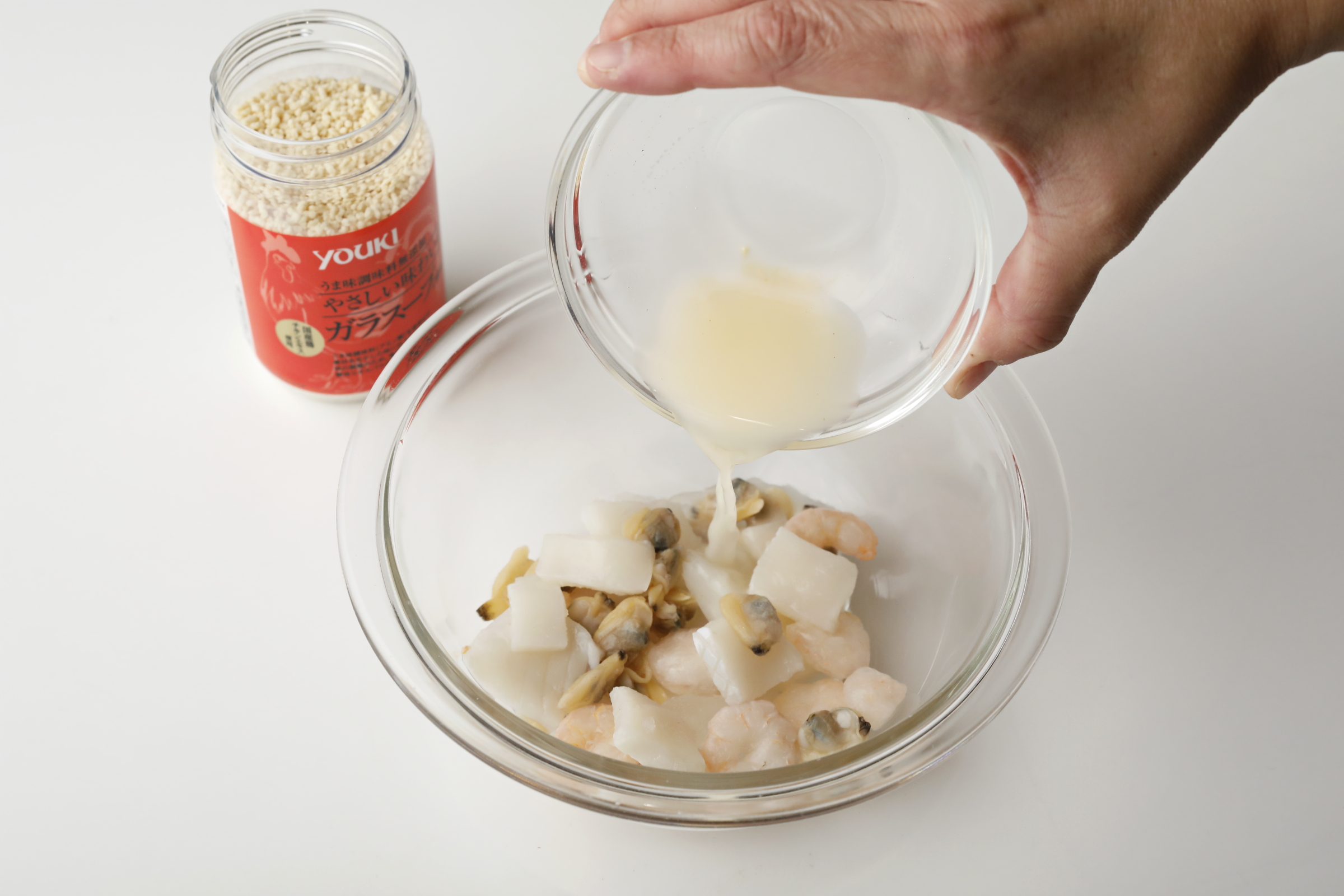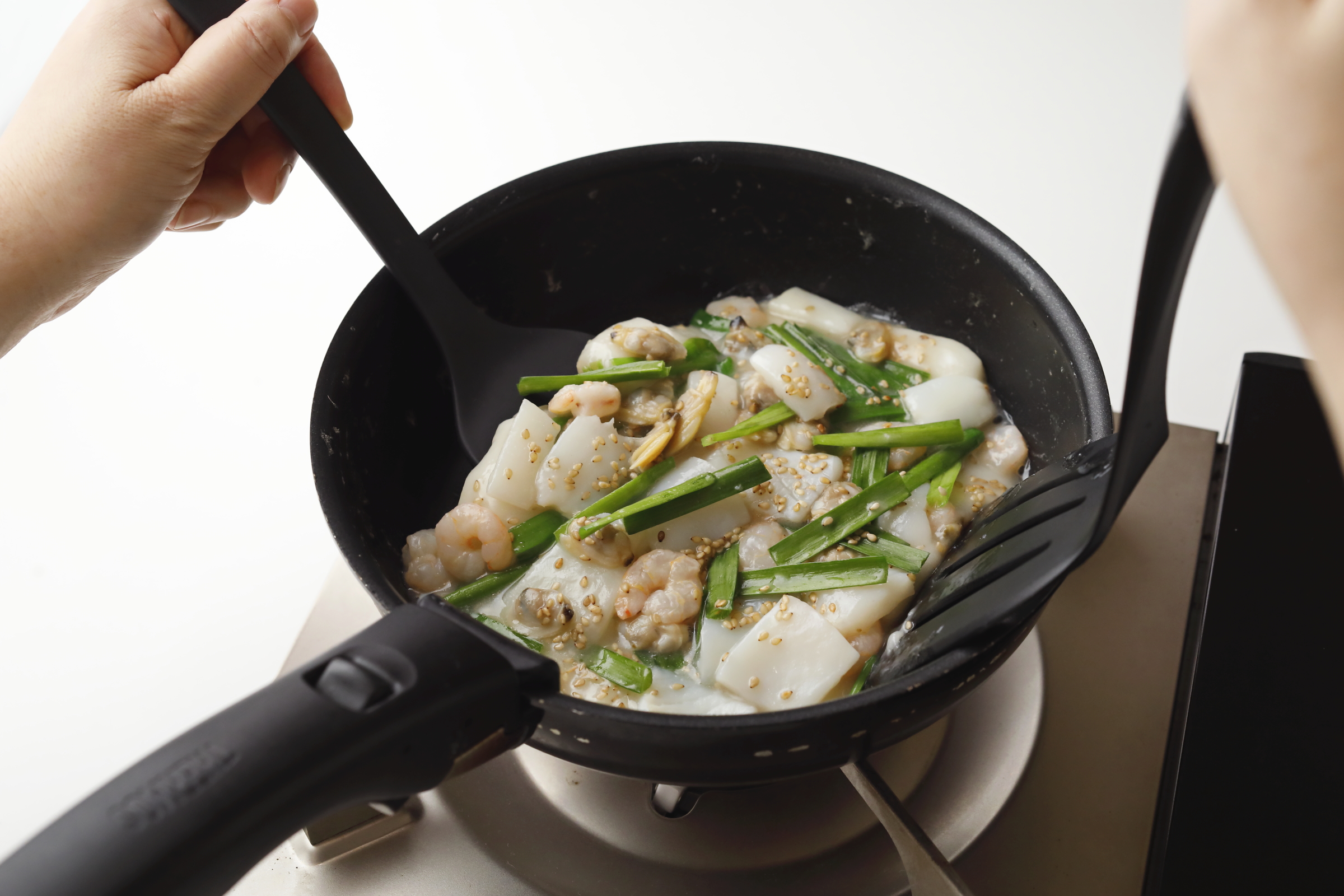 余りがちなお餅がチヂミに大変身! ごま油でじっくり焼いた、カリッと香ばしい食感にきっと驚くはず。具のシーフードミックスにガラスープをからめておくことで、おいしさがぐんとアップします。