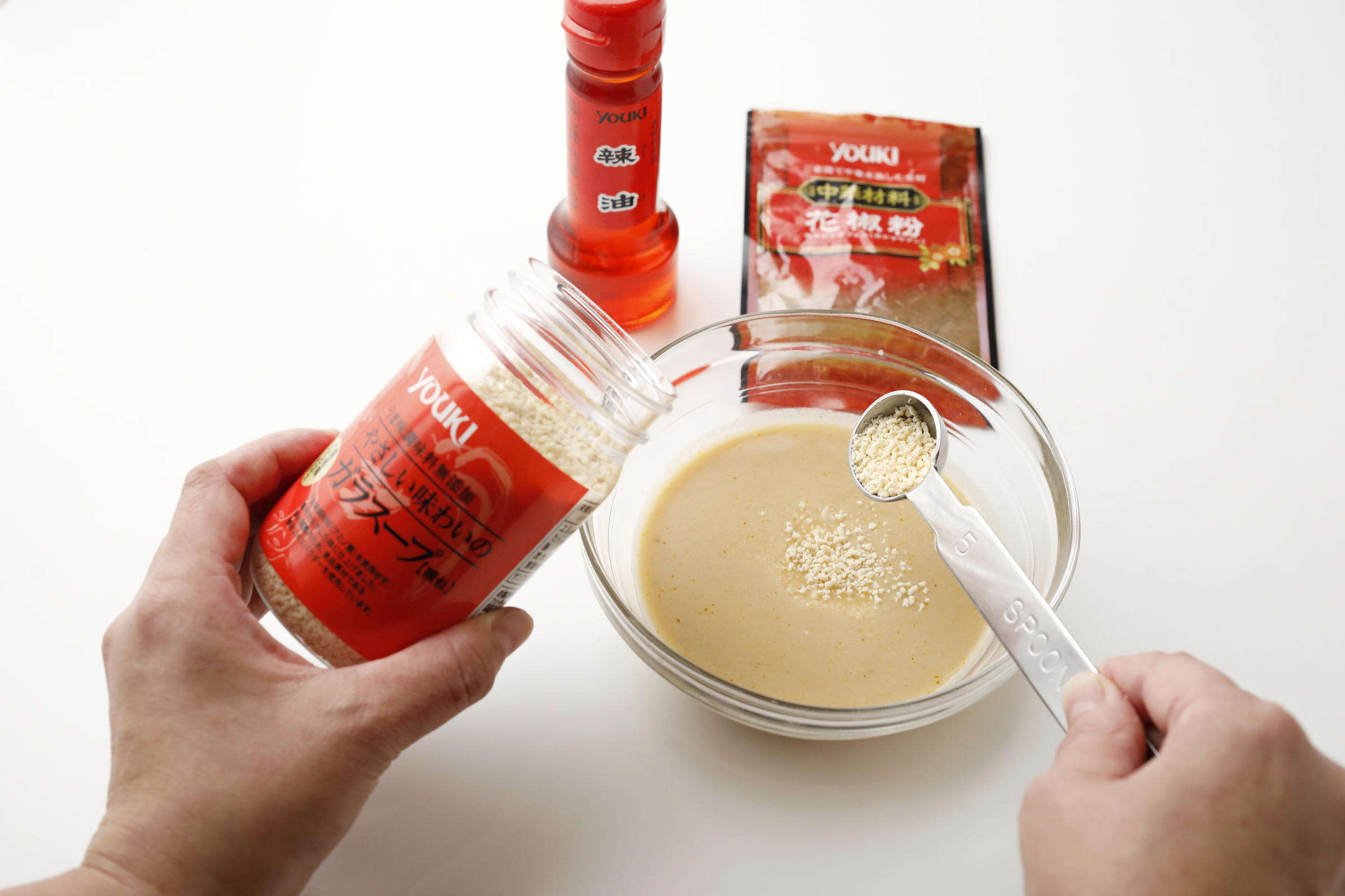 担々麺風の濃厚な中華風ごまだれ。ラー油の量でお好みの辛さに調節して。