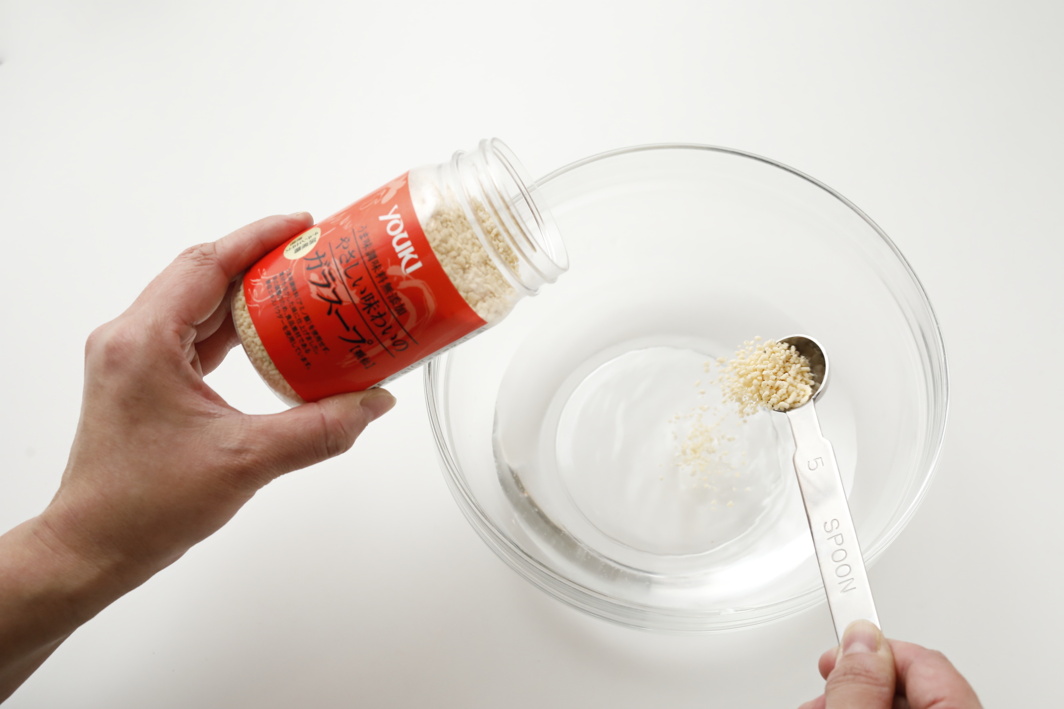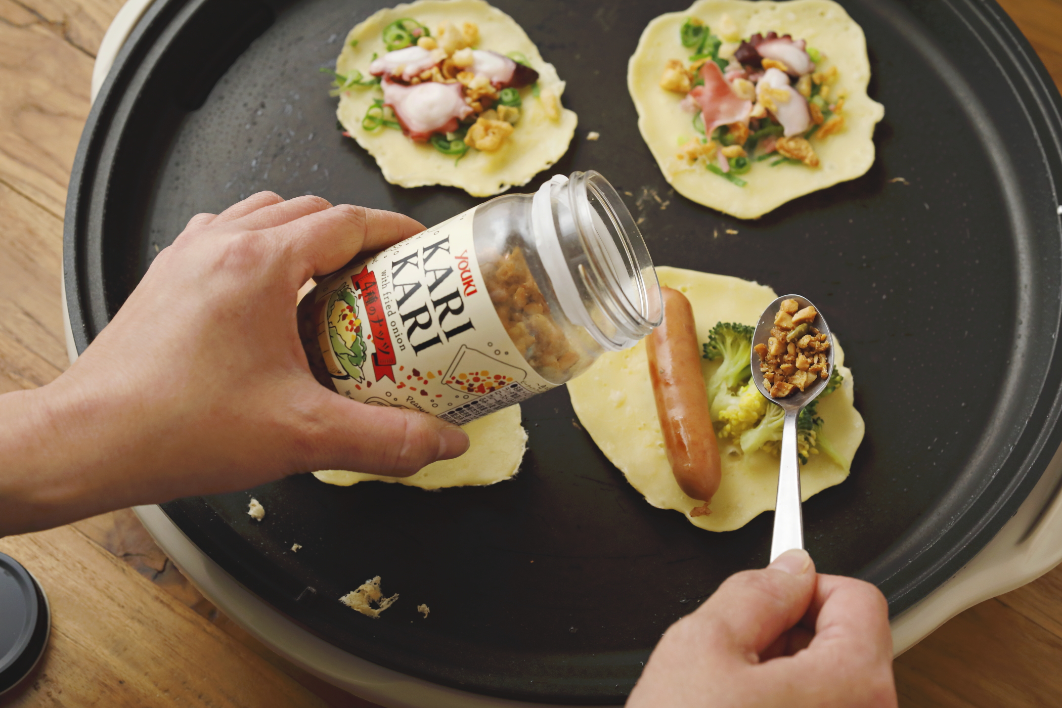 ホットプレートで作る平らなたこ焼き。ガラスープのうまみを加えた生地を薄く広げ、たこの他、ソーセージやブロッコリーなどお好みの具材をのせて、いろいろな味わいを楽しめます。たこ焼き用のプレートがなくてもできるのも、うれしいところです。