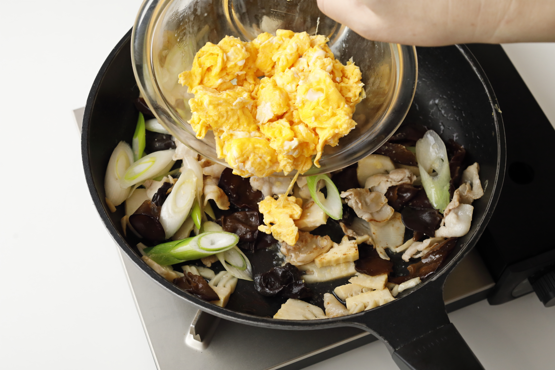 町中華でも人気のメニュー「木須肉(ムースーロウ)」を、家庭でも手軽に。ガラスープを使うことで、簡単だけどしっかりうまみを感じられる味わいに仕上がります。卵は堅くなりすぎないよう、最初に炒めて最後に戻し入れるのがポイント。