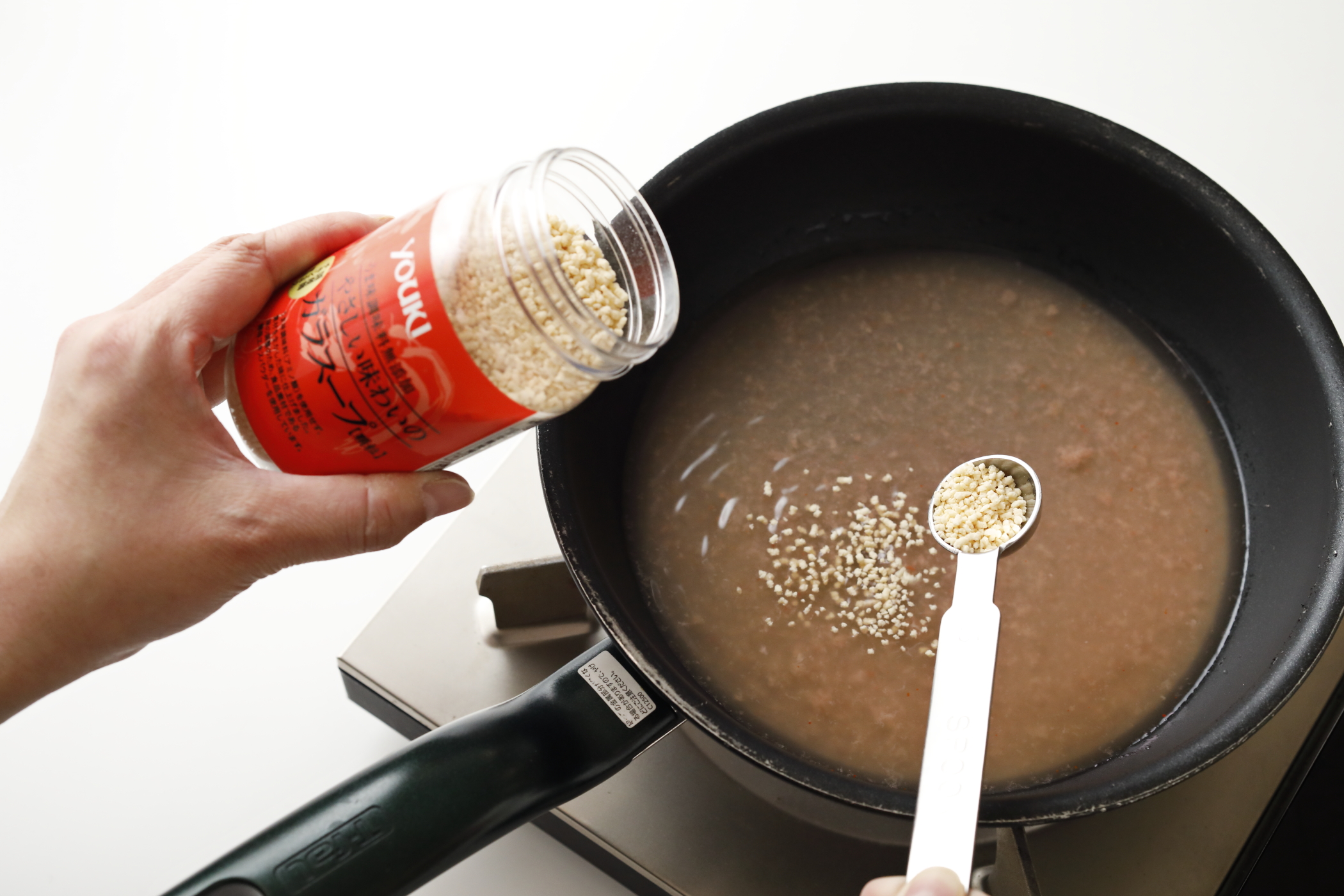 ③小鍋に〈B〉の材料を入れて混ぜ、中火にかける。混ぜながら煮て、とろみがついたら2にかけ、青じそをのせる。