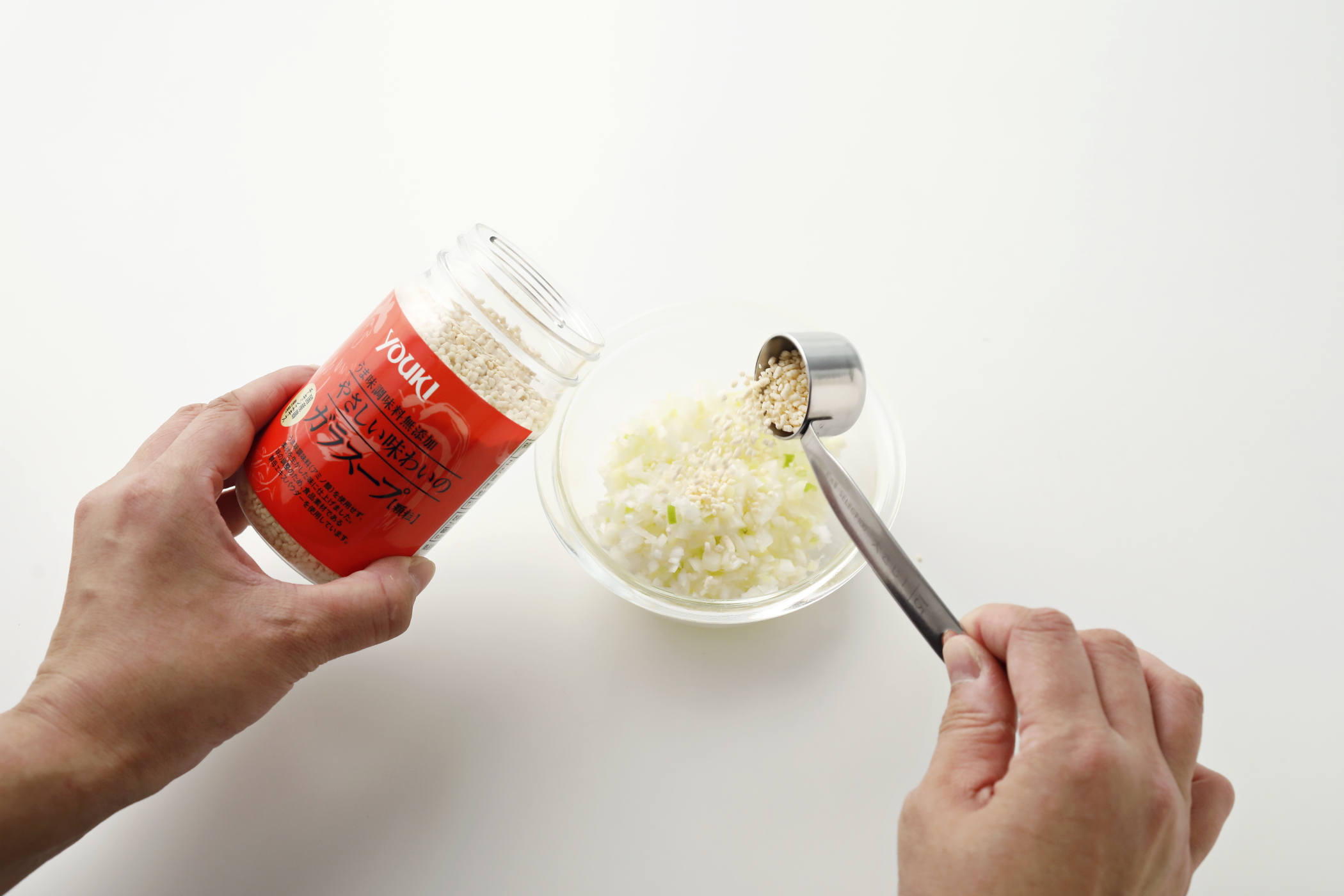 鶏むね肉と豆腐を重ね、卵液にくぐらせてこんがりと焼き上げます。動物性と植物性のたんぱく質が同時にとれるうえ、ヘルシーなのもうれしいところ。下味とねぎ塩レモンだれの両方にガラスープを使い、うまみたっぷりに仕上げます。