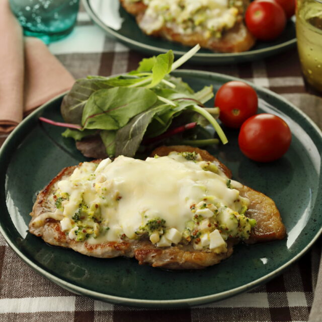 豚肉に、きのこや野菜を混ぜ込んだタルタルソースを重ね、さらにチーズをのせて焼き上げてボリューム満点に。タルタルソースにガラスープを加えると味に深みが出ます。豚肉には小麦粉をまぶさず、ソースに砂糖やみりんを使わないから、糖質が気になる人にもおすすめ!