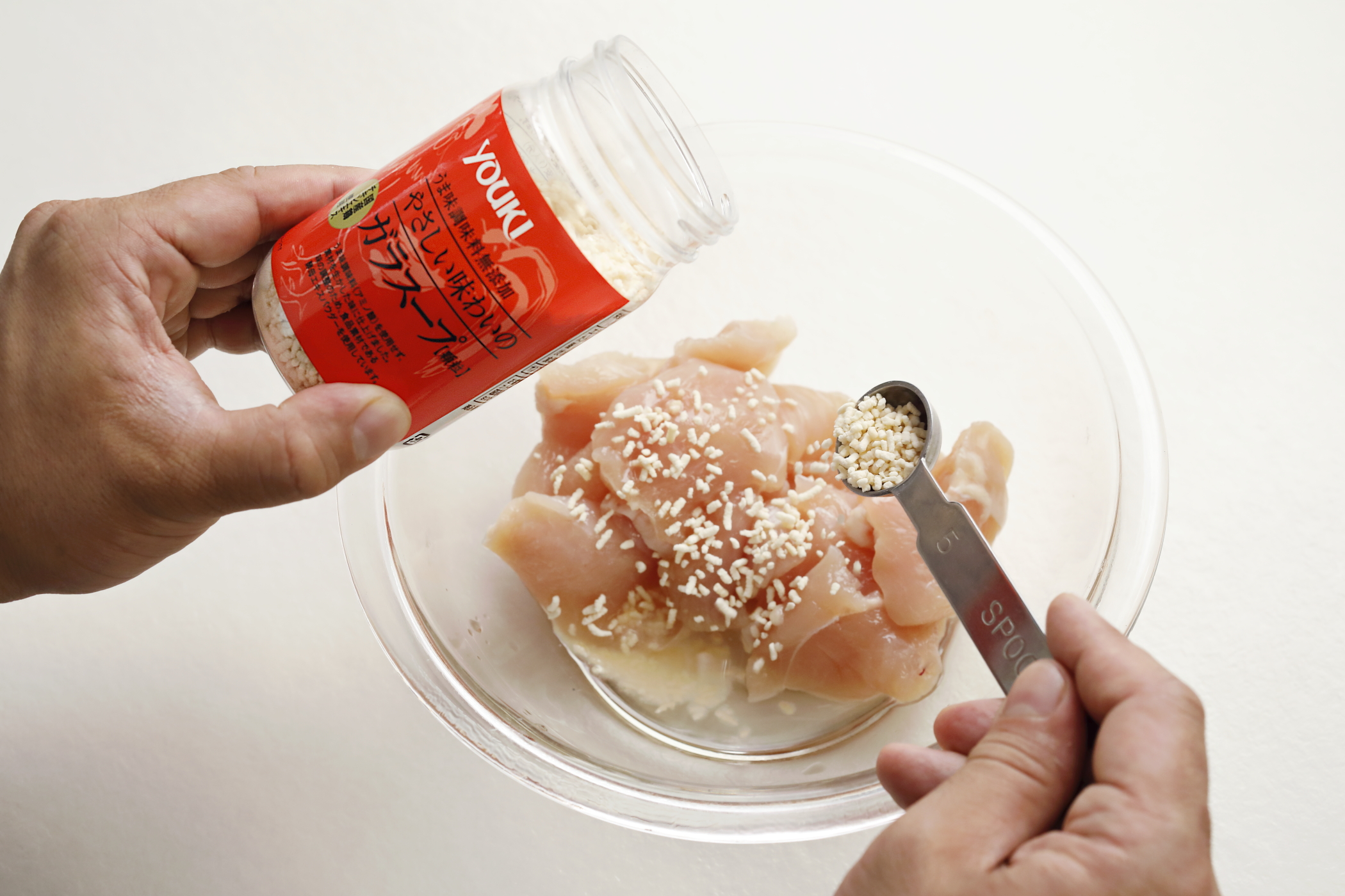 ガラスープはから揚げの下味にも大活躍。酒、みりんと合わせてもみ込むことで、淡泊な鶏むね肉にうまみが加わり、しっとりと柔らかく仕上がります。さめてもおいしいので、お弁当にも重宝します。