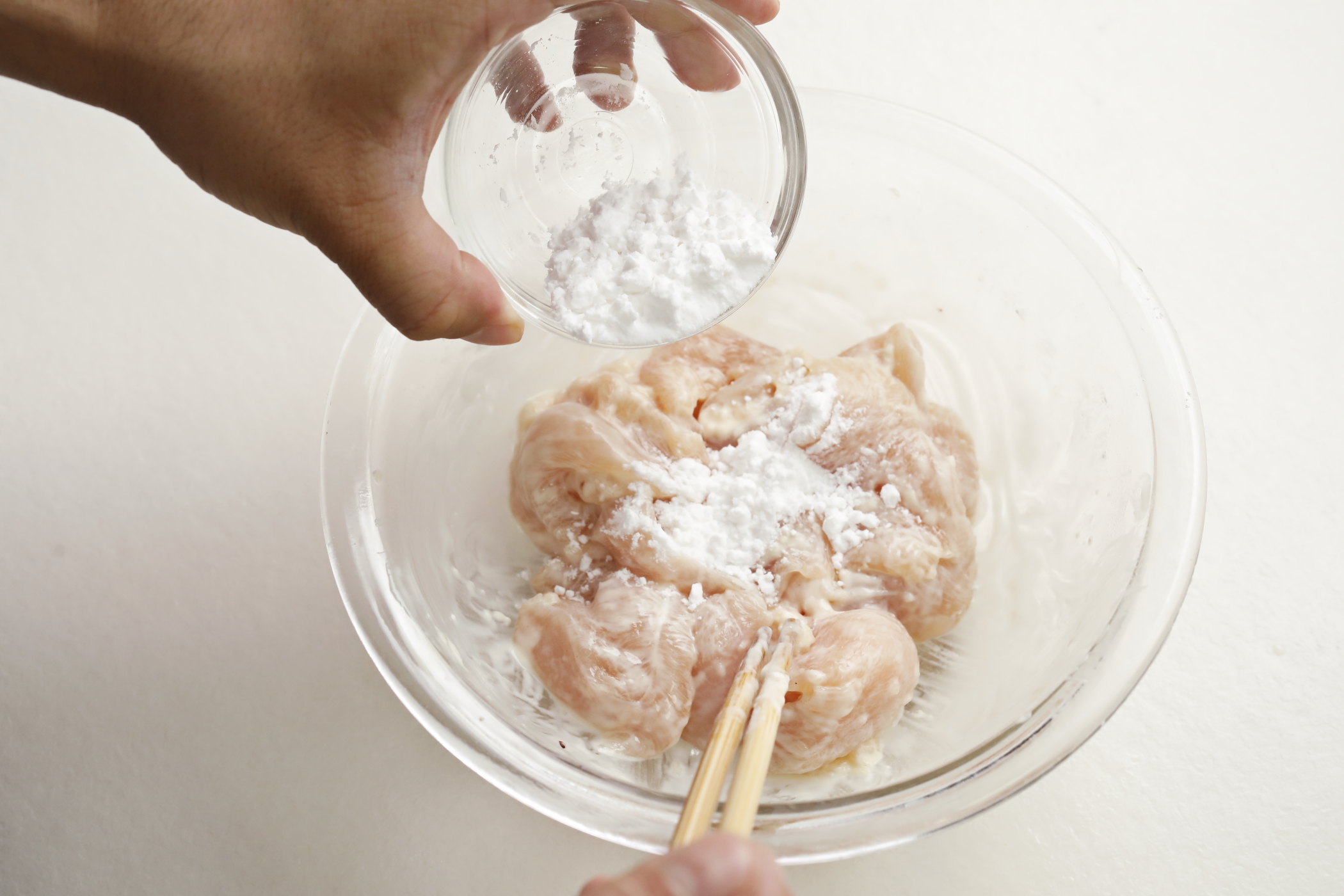 ②〈B〉の小麦粉を加えてよく混ぜてから片栗粉を少しずつ加え、全体にまぶす。