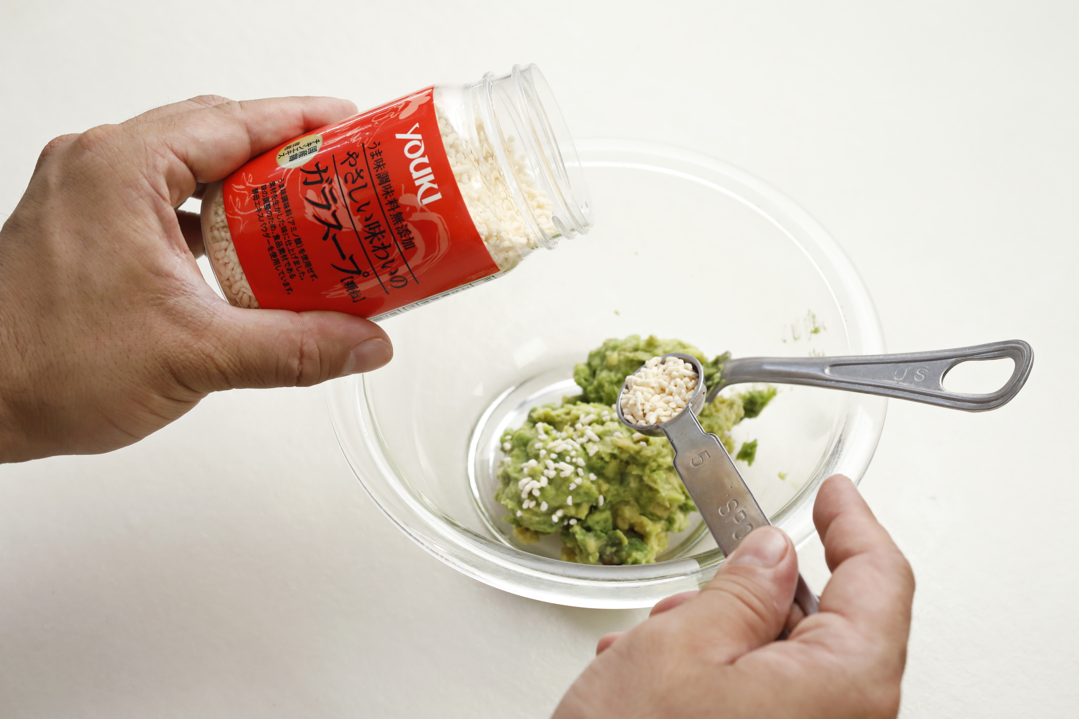 なめらかにつぶしたアボカドにガラスープを合わせて、リッチな味わいのディップに。たった5分で、おしゃれなおつまみが完成! パンはもちろん、クラッカー、野菜スティックを合わせても〇。