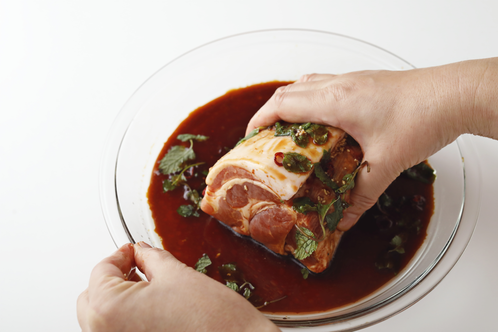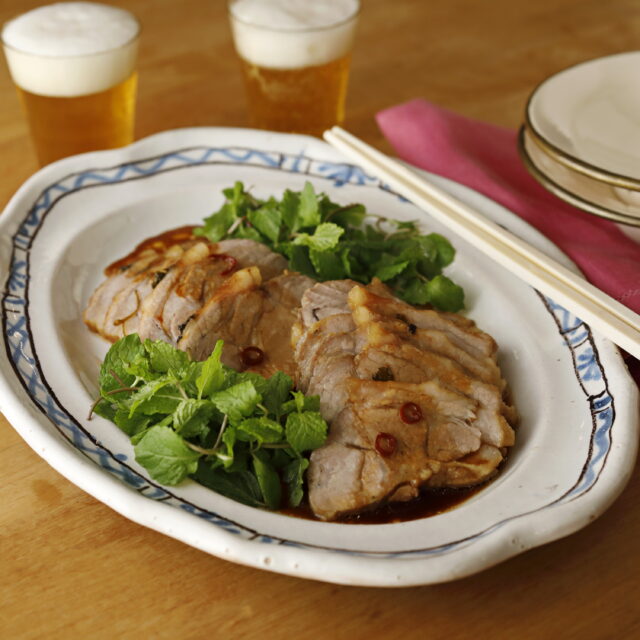 こっくり甘辛味にミントのさわやかな風味をプラスした新鮮な味わいのチャーシュウ。下味にガラスープを加え、豚肉のうまみをグッと底上げします。レンジで作ったとは思えない柔らかさに感激すること間違いなし!
