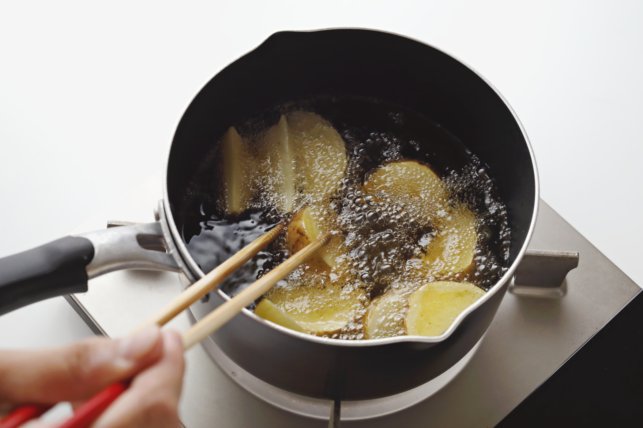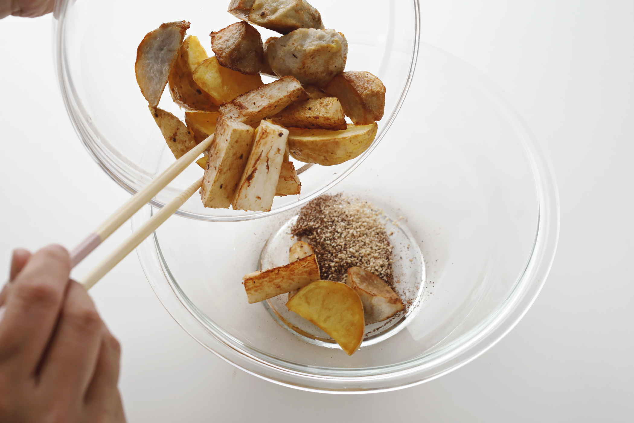 3種類のいもを素揚げにし、ガラスープのうまみと塩味をきかせたスパイスをまぶします。あとをひくおいしさに手が止まらなくなることうけあい! ガラスープは粒をつぶしてパウダー状にすることでからみやすくなります。
