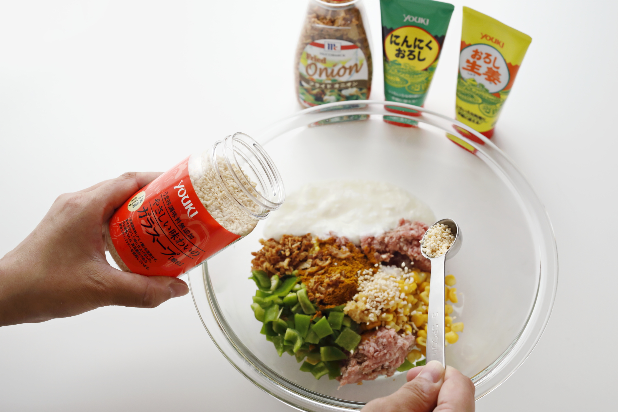 ガラスープのうまみに加え、コーンの甘みとヨーグルトのまろやかさで、子どもも食べやすいカレーに。フライドオニオンを加えることで、あめ色玉ねぎのような香ばしさとコクが出ます。