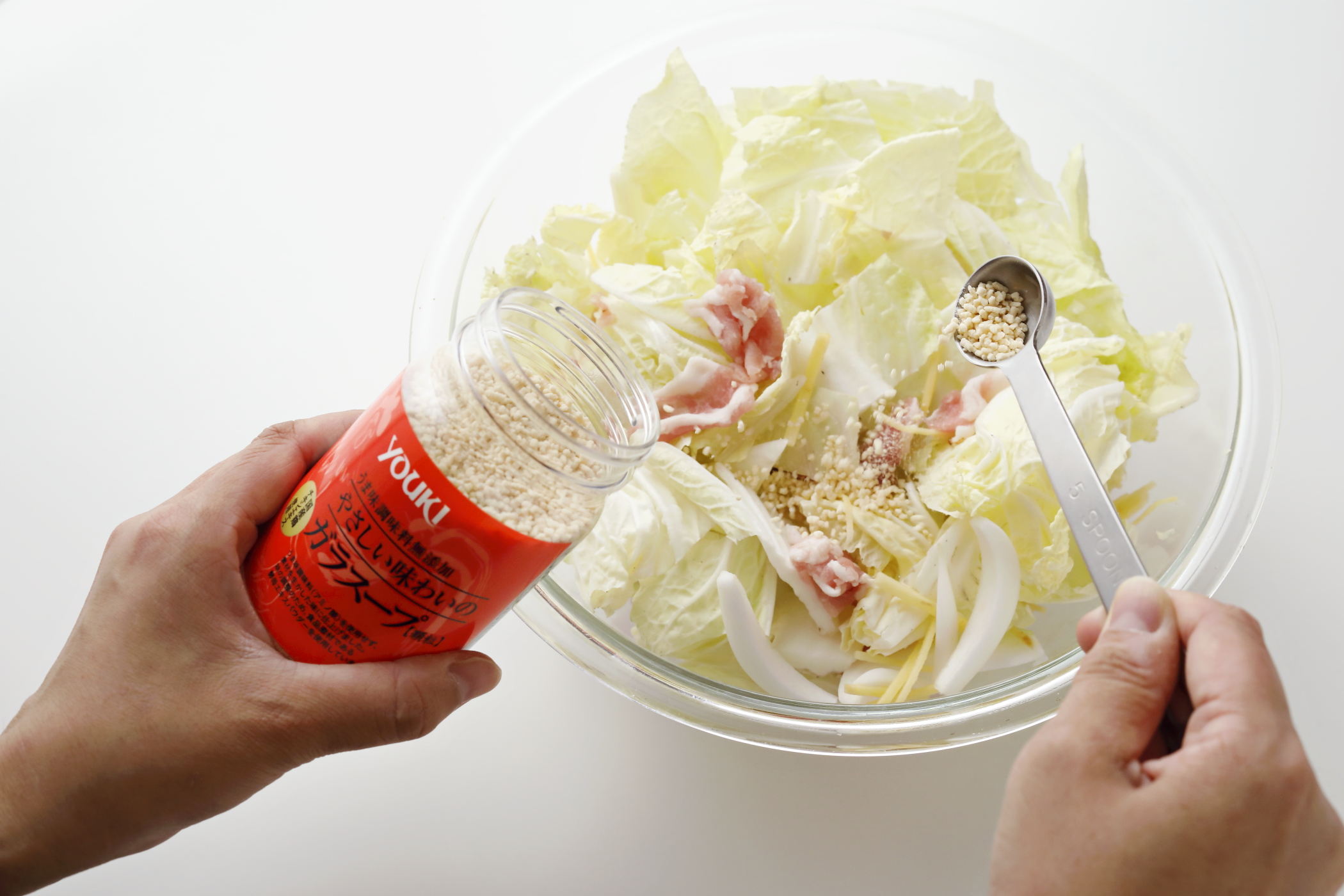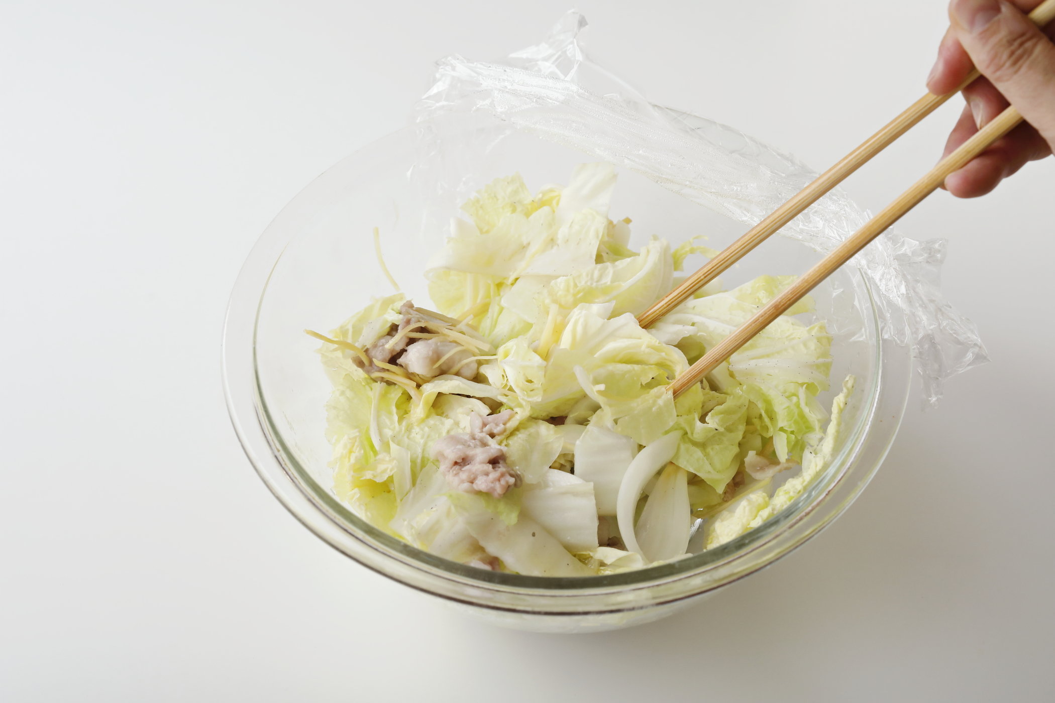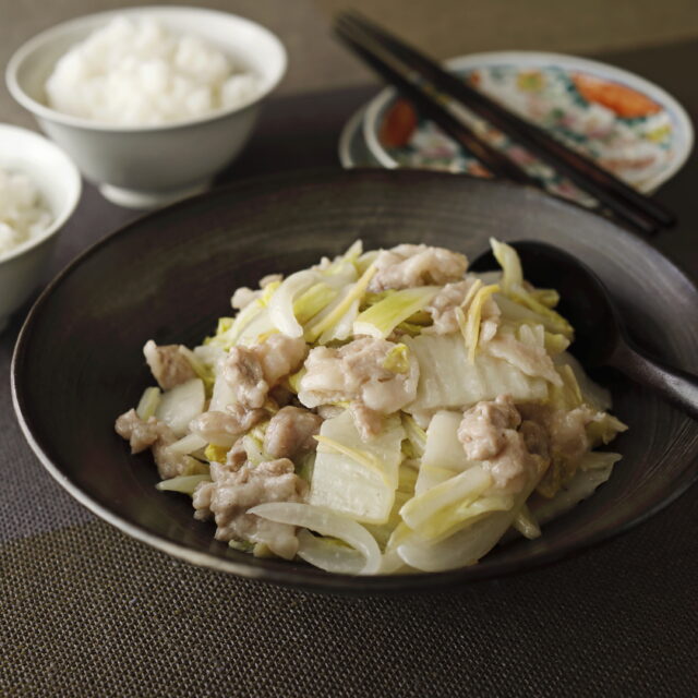 レンジでできる炒めもの風の一品。豚肉に片栗粉をまぶしておくことで、加熱して白菜から出た水分となじんでとろみがつきます。ガラスープのうまみがきいた塩味がごはんによく合うので、中華丼にするのも◎!