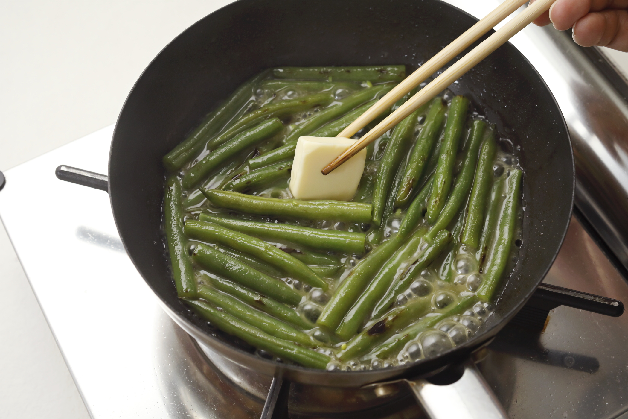 さやいんげんが主役になる、旬の時期にうれしい一品。ガラスープ+バターの「コクうま味」がしっかりとからみ、くたっとした柔らかい口当たりがなんともあとをひきます。とろりとした蒸し汁ごと、パンにのせていただくのもおすすめです。