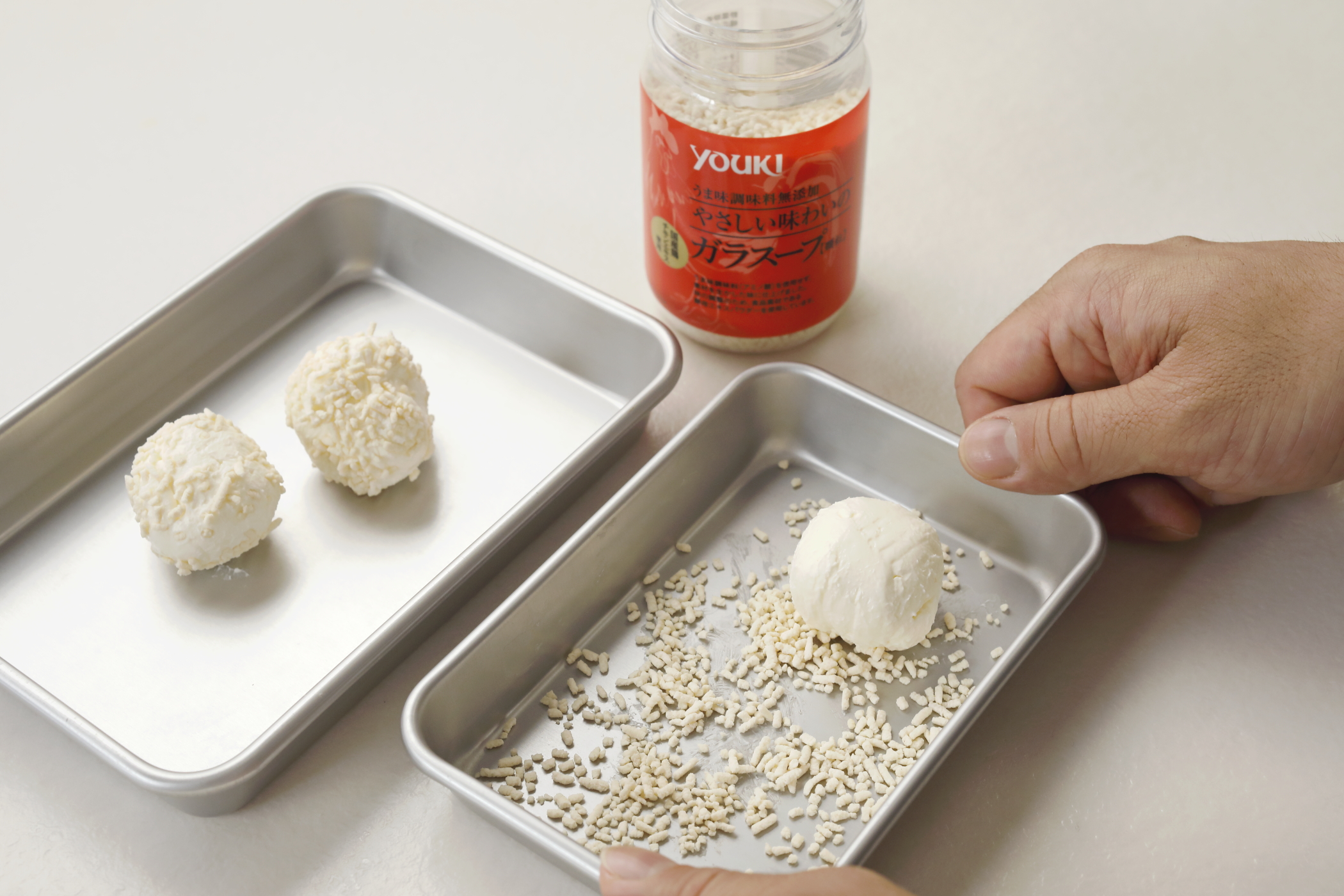 ①クリームチーズは室温に戻す。小さめのラップを広げ、中心にチーズの1/4量をのせる。ラップの周囲を中心で集めてからねじって、ボール状に形を整え、ラップをはずす。残りも同様にする。