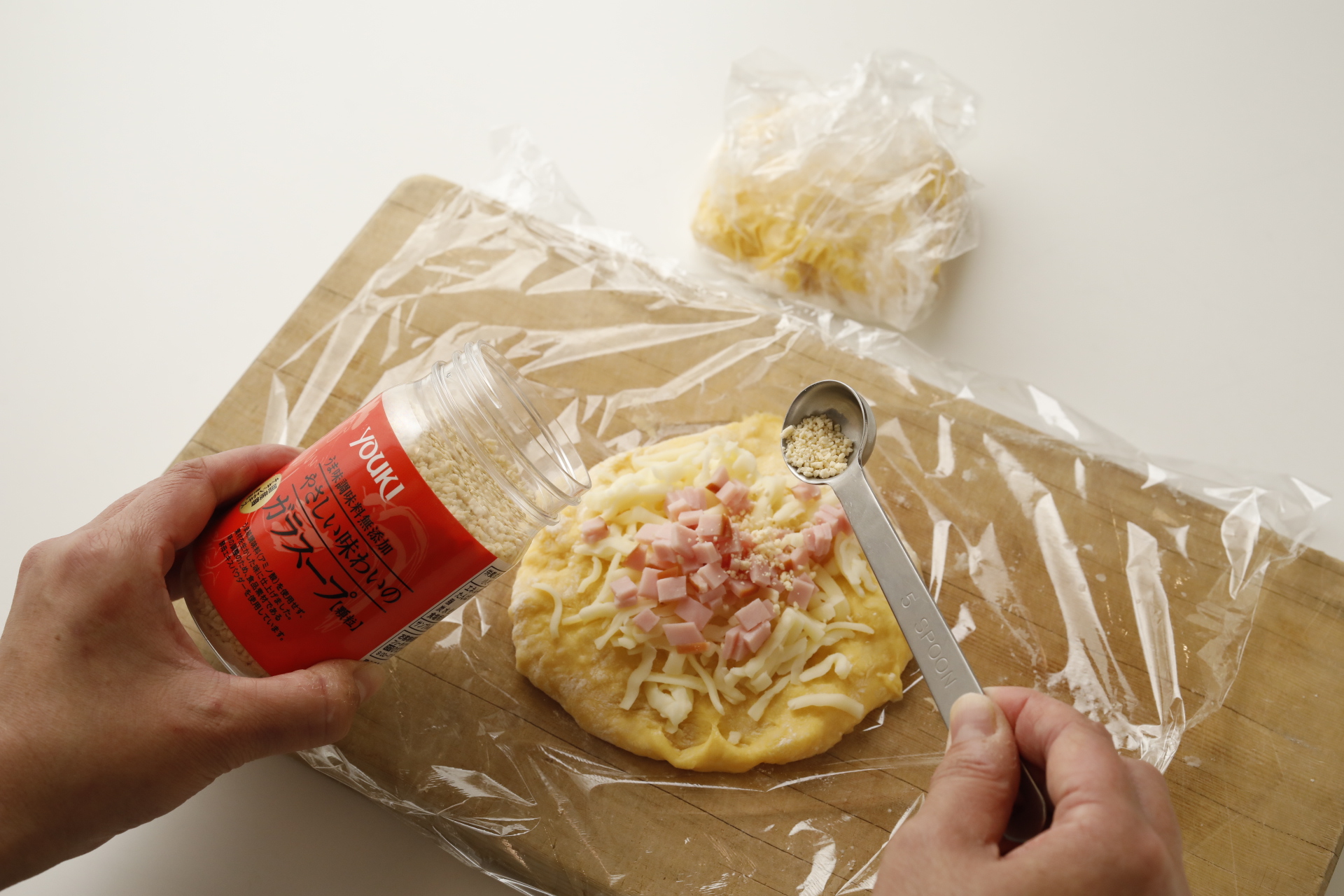 レンジで柔らかくした餅に粉を加えてもっちりとした生地にします。ハムとチーズといっしょにガラスープを包み込んで焼けば、うまみが増し増しに! フライパンで焼ける手軽さも、うれしいところです。