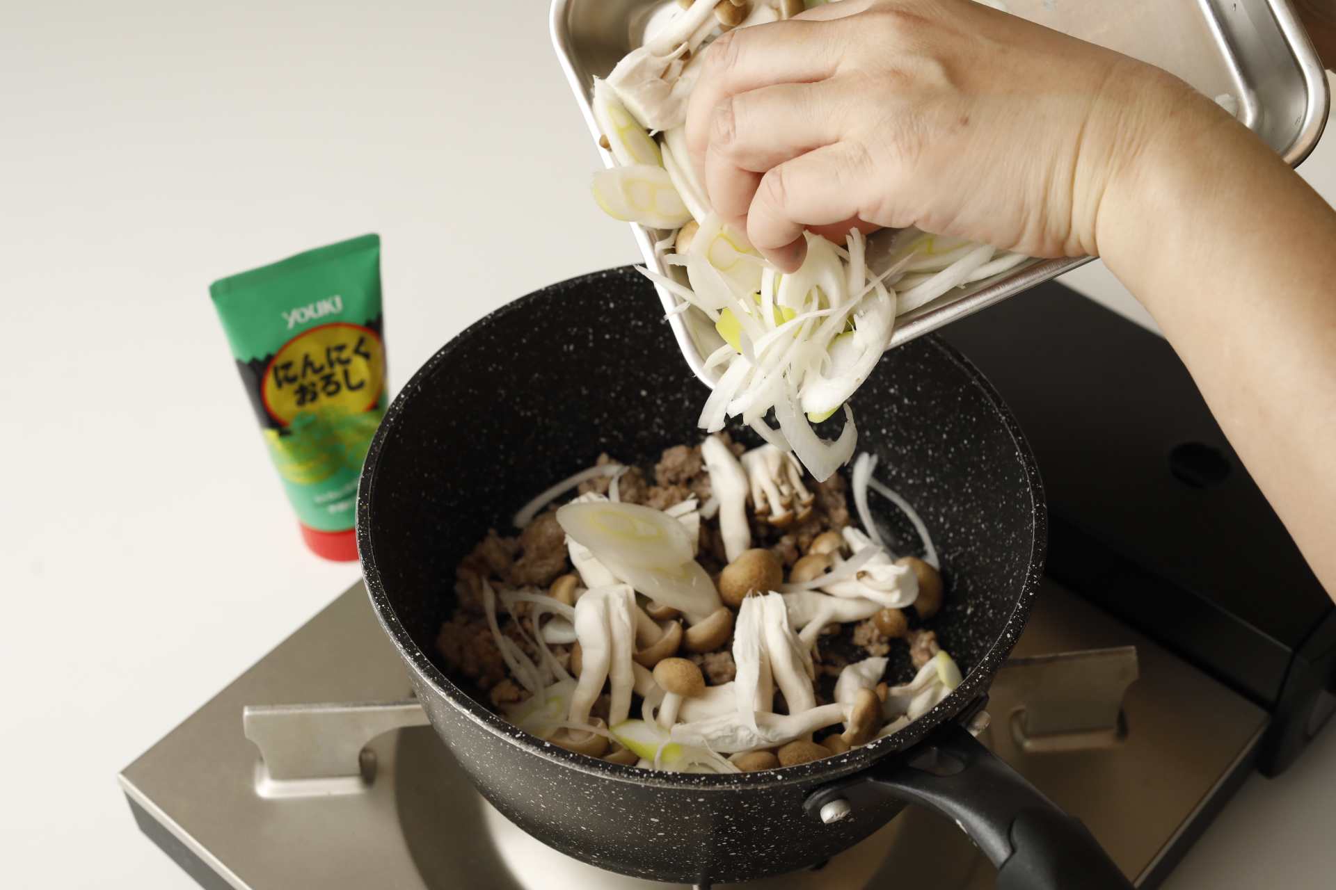 ①長ねぎは斜め薄切りにする。しめじは石づきを取ってほぐす。鍋にひき肉を入れて中火にかけ、脂が出てきたら、にんにくを加える。にんにくの香りが立ったらしめじ・ねぎを加えて炒める。