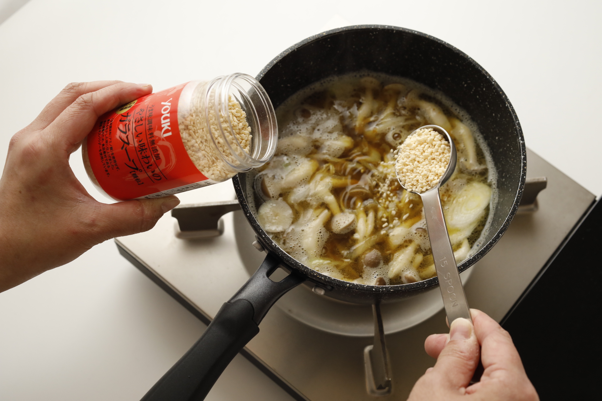 ②しめじがしんなりとしたら水2カップを加えて煮立て、カレー粉・ガラスープを加えて混ぜる。再び煮立ったら牛乳を加え、煮立つ直前に火を止める。